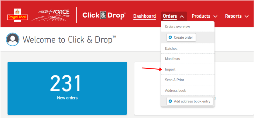 From any page within Click & Drop, hover your mouse pointer over the ‘Orders’ header, and from the drop down box, click 'Import'.