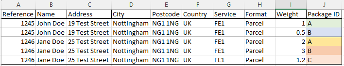 In our example spreadsheet below, we have 2 orders. We have specified the Package identifier in column N, but please note your spreadsheet, the package identifier value can be in any.