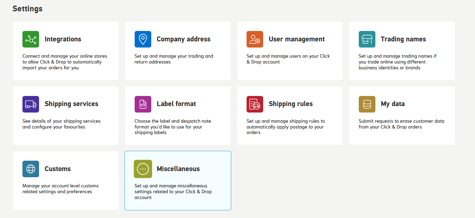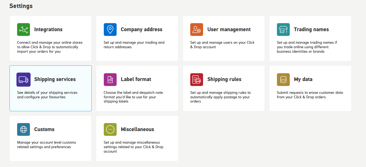 To do so, first click the 'Settings' link from the top right corner of any page within Click & Drop and you will be navigated to the 'Settings' page.