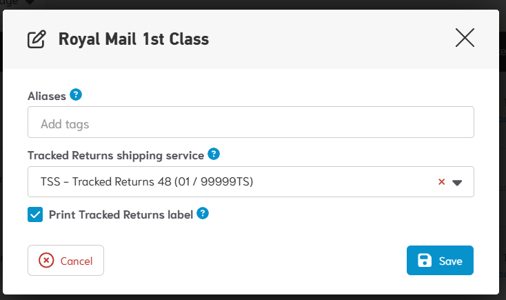 From the drop-down menu in the window, choose the Tracked Returns service and tick the Print Tracked Returns label checkbox. Click the blue 'Save' button when finished.