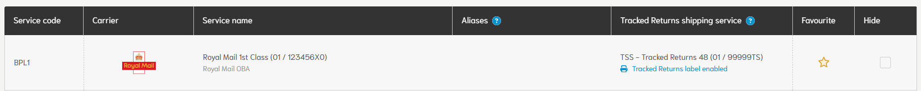 You should see the Tracked Returns service in your services grid, along with a note saying 'Tracked Returns label enabled':