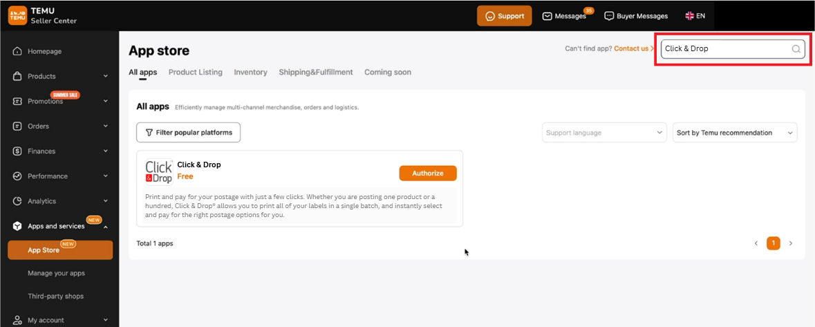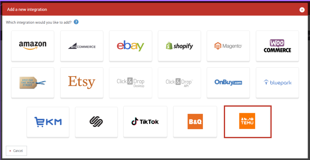 5. Create Temu integration in Click & Drop