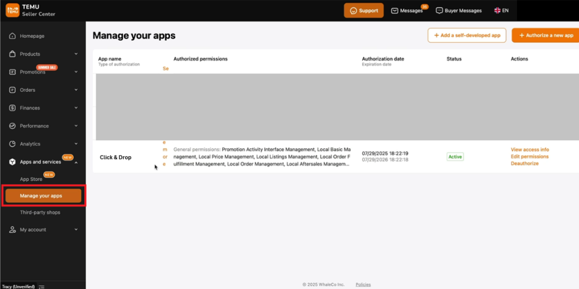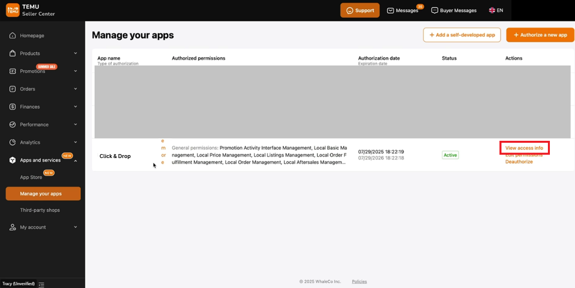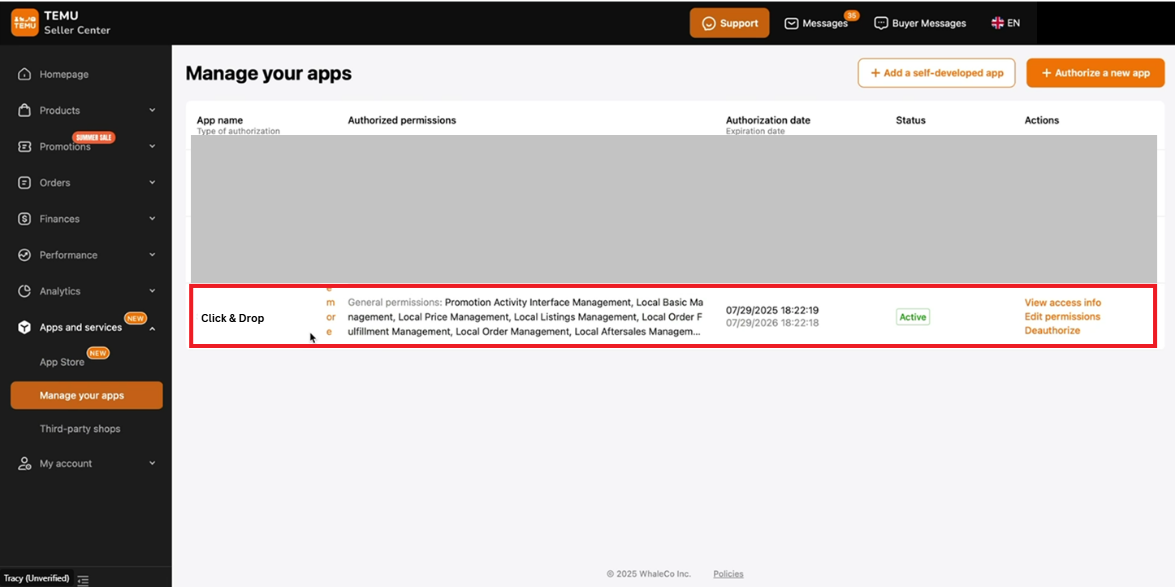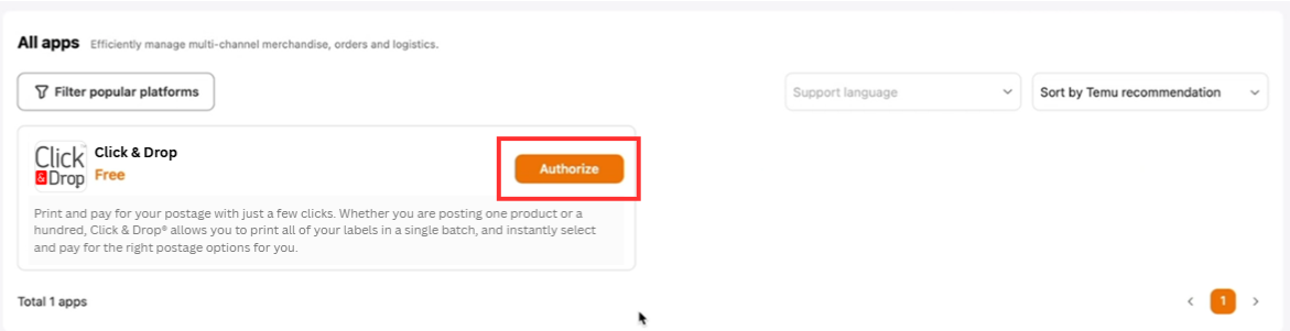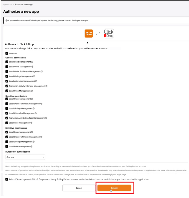 The access token allows Click & Drop to securely connect with your Temu account to:
