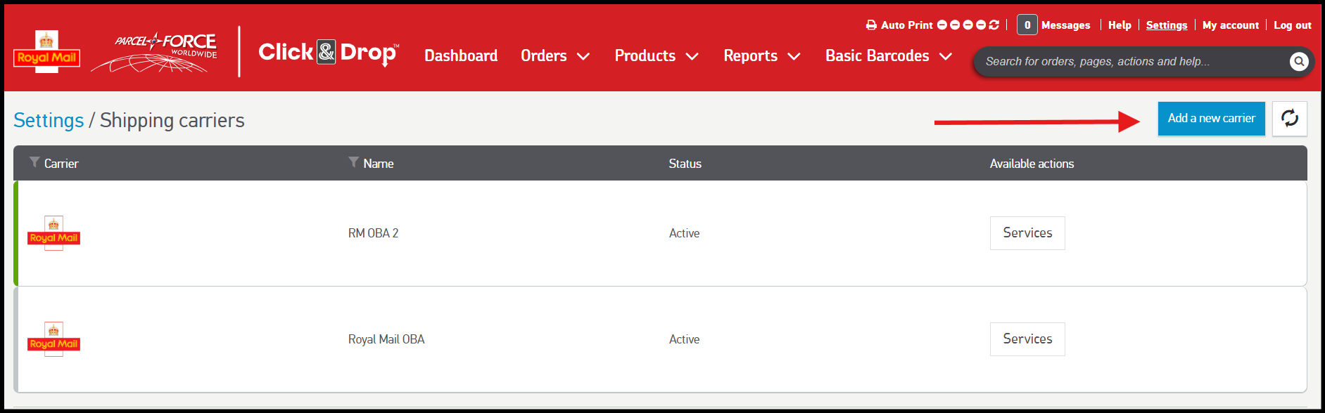 Click the 'Add New Carrier' button to continue, and repeat as many times as you require.