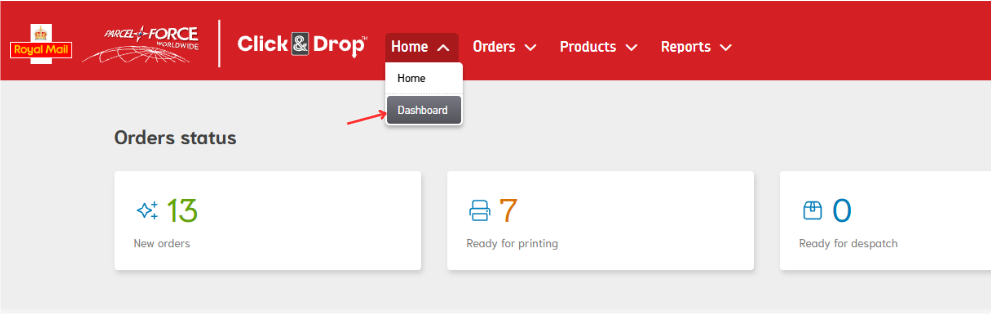 To access, hover over the 'Home' link from any page within Click & Drop and click 'Dashboard'.