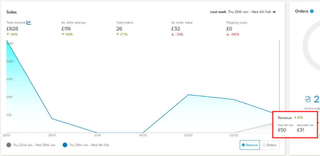 This tile displays an overview of the number of orders/sales received over a chosen time period. We use this data to try to calculate your estimated revenue.