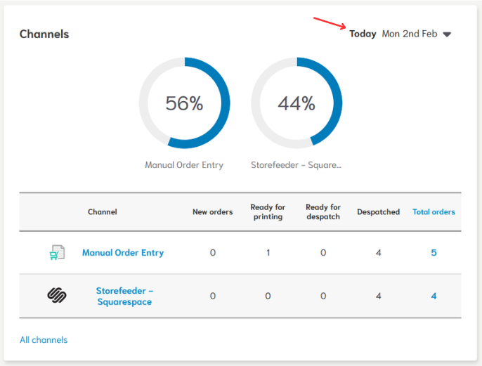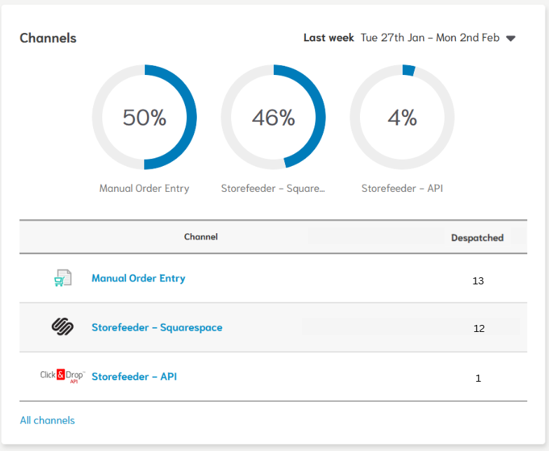 The above example shows that the majority of orders in the last week have been imported manually (or through spreadsheet import), followed by Squarespace and only 4% of orders have come through the Click & Drop API