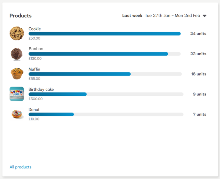 The best selling product in the last week was Cookie with 24 units sold and an estimated revenue of £50. The item bringing in the most revenue was Birthday cake with 9 units sold and £300 estimated revenue