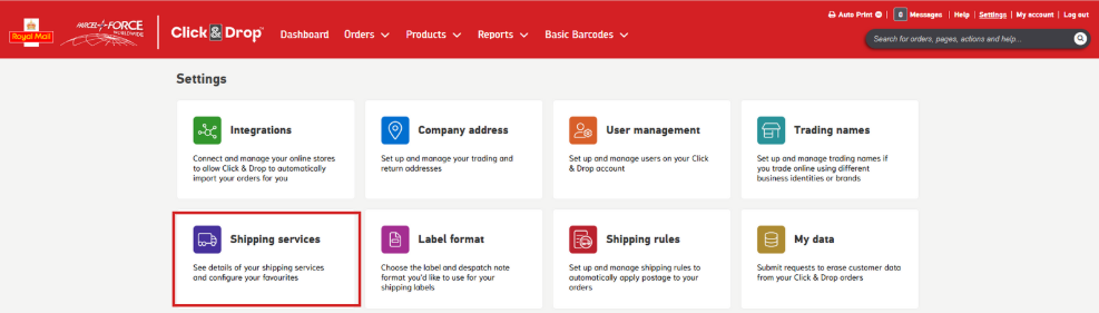To view your available service register codes, click 'Settings' from any page within Click & Drop. The settings/Overview page will load. Click the 'Shipping services' tile.