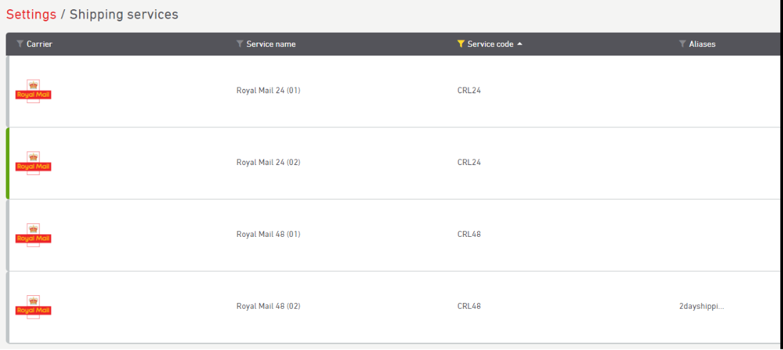 You will be presented with a list of all your available shipping services. You may note that you might have more than one instance of a service, each of which will have its own service register code. In our example below, we have CRL24 and CRL48 services, each of these has a 01 and a 02 variant.